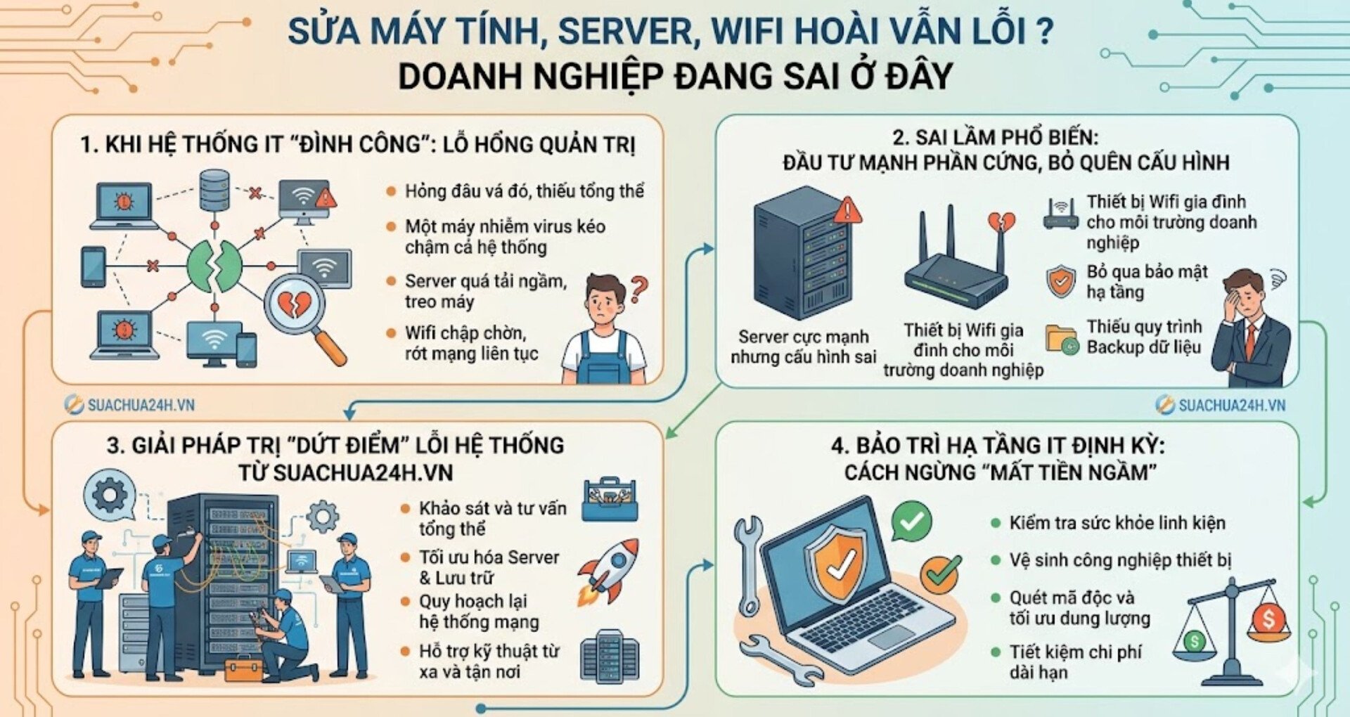 “Sửa Máy Tính, Server, Wifi Hoài Vẫn Lỗi? Doanh Nghiệp Đang Sai Ở Đây” không chỉ phản ánh thực trạng phổ biến tại nhiều doanh nghiệp, mà còn chỉ ra rằng việc sửa chữa thiếu tổng thể chính là nguyên nhân khiến lỗi liên tục lặp lại, gây gián đoạn và phát sinh chi phí không cần thiết.